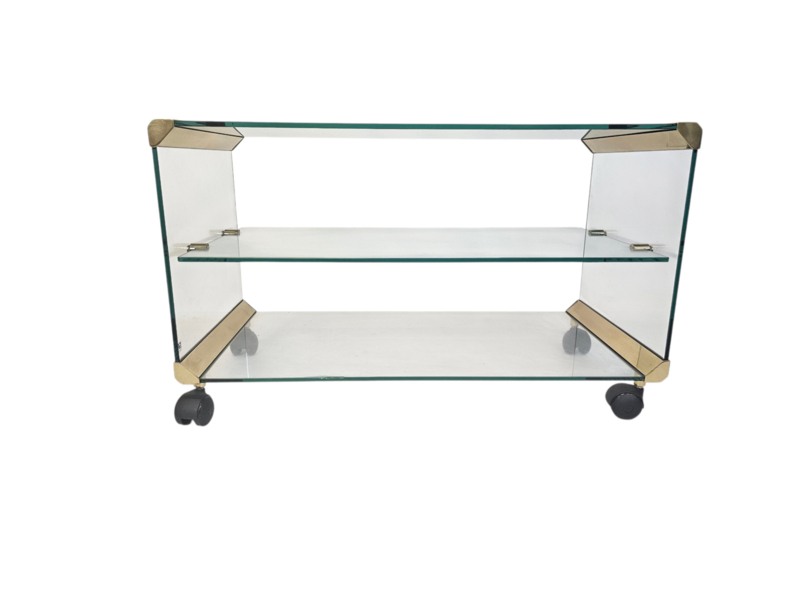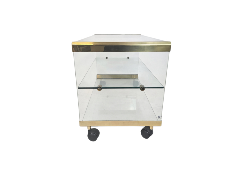 Sidetable op zwarte wieltjes van Galotti & Radice Italië jaren 70. Gemaakt van hoogwaardig glas en messing verbindingsdelen. Uitstekende staat. Ook te gebruiken als salontafel of tv meubel.