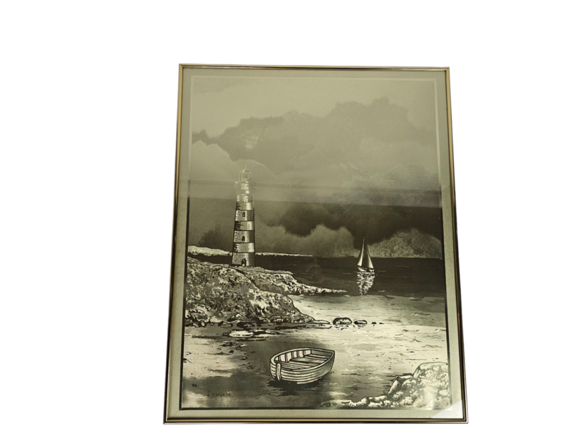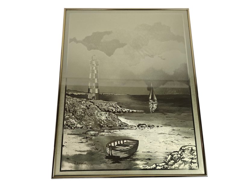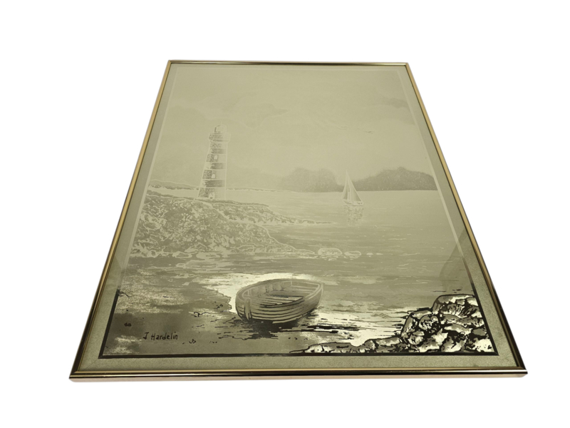 Deze glimmende vintage goudfolie gravure is gemaakt door J. Hardelin in 1976 in Parijs. Afgebeeld zeegezicht met een aanmerend roeibootje en in de verte een vuurtoren en zeilend schip. De goudfolie-techniek geeft dit artwork een metallic effect. De uitstraling van de gravure verandert elk moment van de dag subtiel, afhankelijk van hoe het oppervlak het zonlicht vangt. Heel bijzonder!