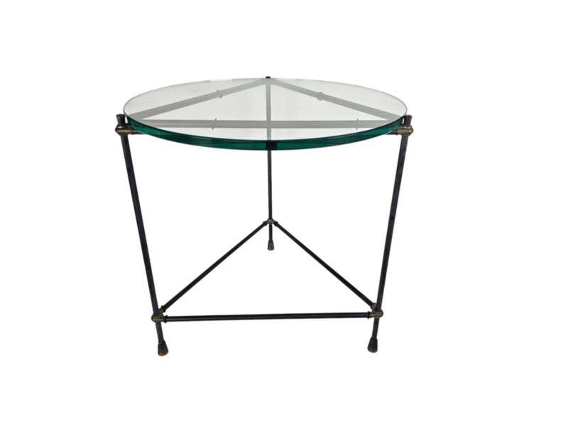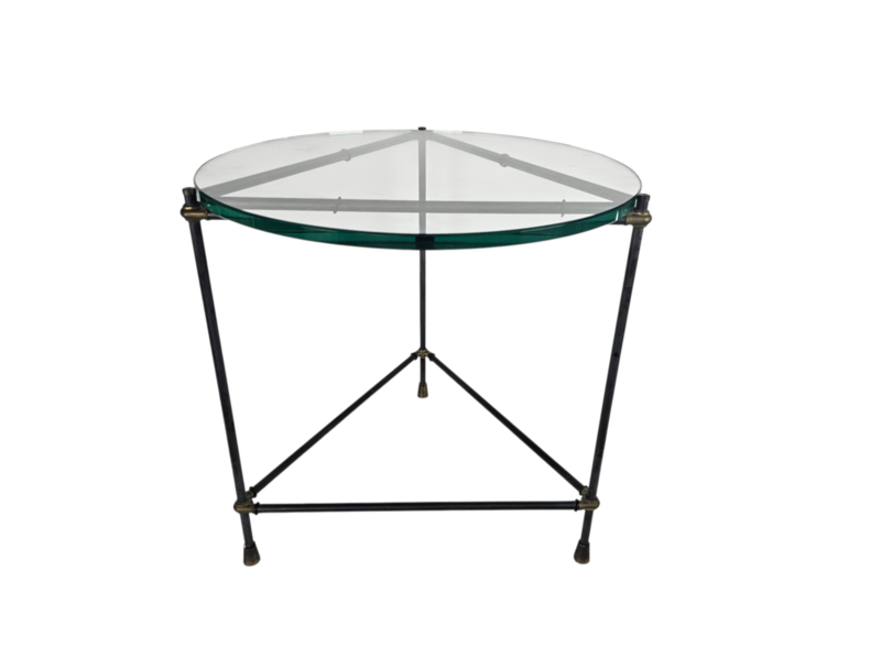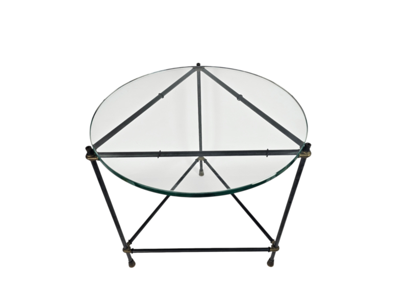 Massief glazen blad - het onderstel is gemaakt van ijzer en messing, met losse messsing ringgrepen en eindigend in massieve messing kogelpoten. Dit wordt ook wel de Hollywood Regency stijl genoemd