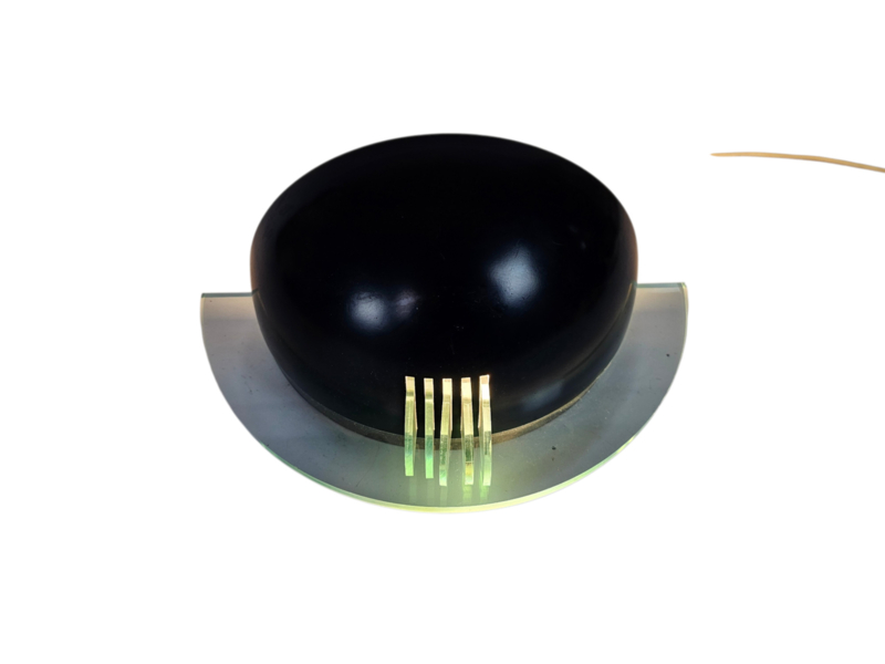 Deze elegante E/Lite model 4502 applique, vervaardigd in Nederland in de jaren '80, is een prachtig voorbeeld van tijdloos design. Het strakke zwarte metalen oppervlak gecombineerd met helder glas zorgt voor een verfijnde uitstraling die perfect past in een modern interieur.