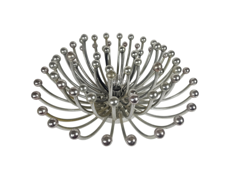 XL zilverkleurige wandlamp of tafellamp model “Pistillo” ontworpen door Studio Tetrach voor Valenti, 1969. De Pistillo lamp (Pistillo is het Italiaanse woord voor stamper) ontleent zijn naam aan het hart van een bloem. Dankzij het bijzondere ontwerp en het reflecterende vergulde ABS kunststof ontstaat er een prachtig lichteffect wanneer de lamp aanstaat. Deze mid-century wand- of tafellamp is in goede staat.