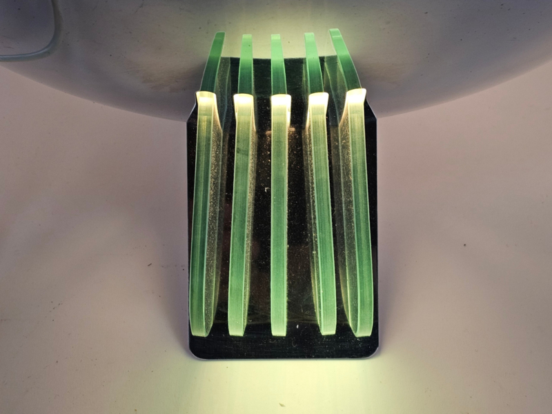 Unieke en zeldzame wandlamp van chroom en glas ontworpen door het Zwitserse bedrijf 'Lumess'. De lamp is gemaakt van verchroomd metaal in combinatie met 5 heldere glazen elementen en een porseleinen fitting aan de binnenkant. Deze lamp is voorzien van zijn originele fabriekslabel. De 'uplighter' zorgt voor een sfeervol, diffuus licht dat zowel naar boven als naar beneden door de glazen elementen schijnt. Dit creëert een speelse en futuristische look, kenmerkend voor het ruimtetijdperk. De lamp heeft een uitstekende decoratieve uitstraling, zowel aan als uit, en past met zijn elegante en tijdloze design in veel verschillende interieurstijlen.