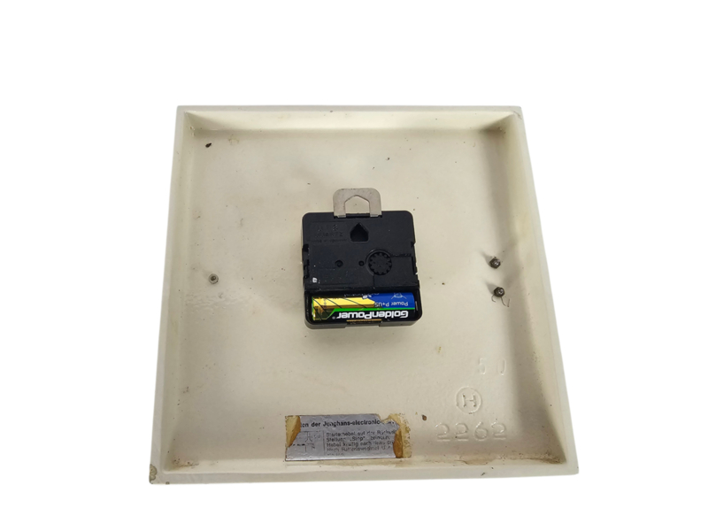 Vintage Junghans electronic Ato-Mat wandklok uit de jaren 60's. Dit specifieke model heeft een vierkante behuizing van geglazuurd keramiek. (aardewerk) met een kenmerkend reliefpatroon in een gebroken witte of creme kleur. Op de achterzijde is naast de originele fabriekssticker het serienummer zichtbaar.