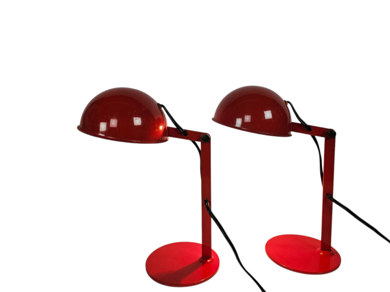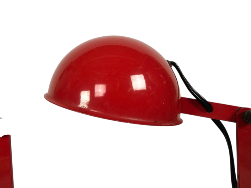 Prachtige oranje/rood tafellampjes uit het midden van de twintigste eeuw, gemaakt van metaal. Het is een minimalistisch, industrieel geïnspireerd ontwerp. De lampenkapjes kunnen verticaal in hoogte worden worden versteld. De lampjes vertonen minimale sporen van gebruik (aan de binnenkant van 1 lampenkapje wat oneffenheden), verder in goede staat en volledig werkend.