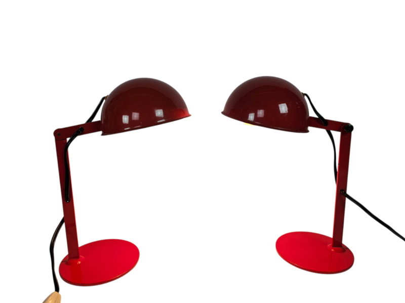 Ontdek de charme van de jaren '70 met deze set van twee Italiaanse bureau- en tafellampen. Deze lampen, met hun opvallende rode kleur en strakke metalen constructie, belichamen de essentie van de Mid Century Modern en industriële stijl. Perfect voor een stijlvol kantoor of een modern interieur.