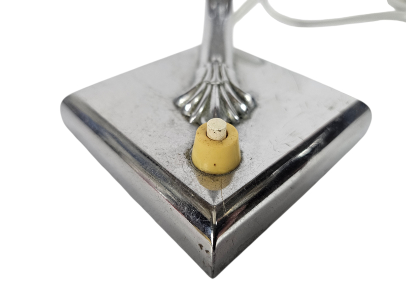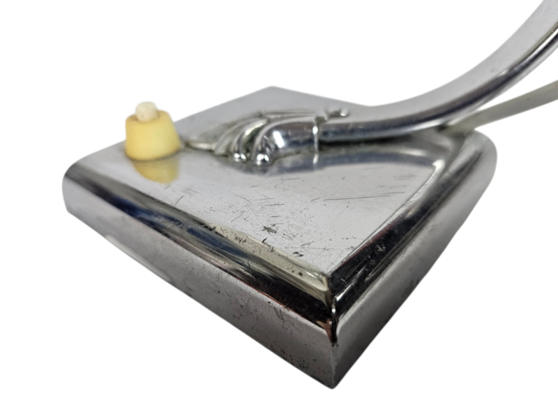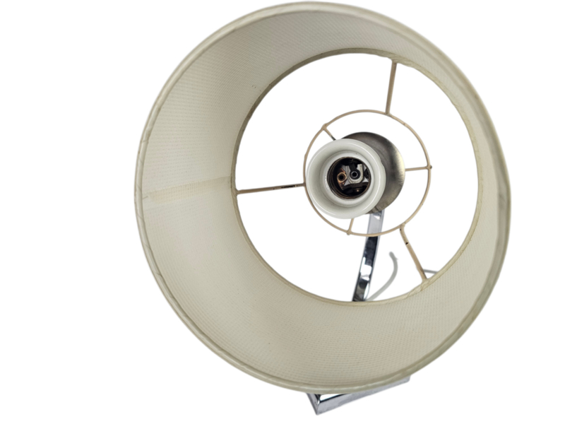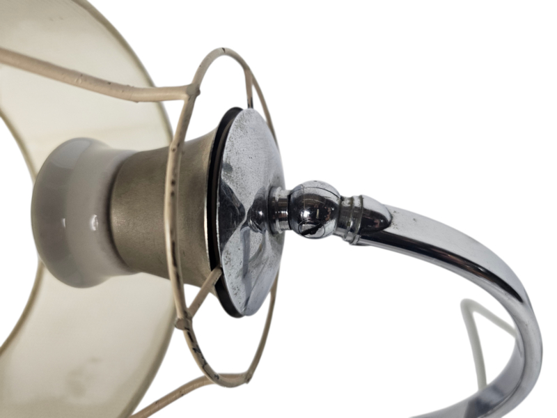 Wandlamp uit het midden van de vorige eeuw, vroeg ontwerp met een zogenaamde "gooseneck" (zwanenhals) die verstelbaar is. Op het chroom is een sierlijk motief aangebracht in de vorm van een schelp kenmerkend voor die tijd. Aan de achterkant van de wandplaat is een uitsparing aangebracht om de wandlamp aan de muur te hangen. Verlichting is getest en werkt naar behoren.