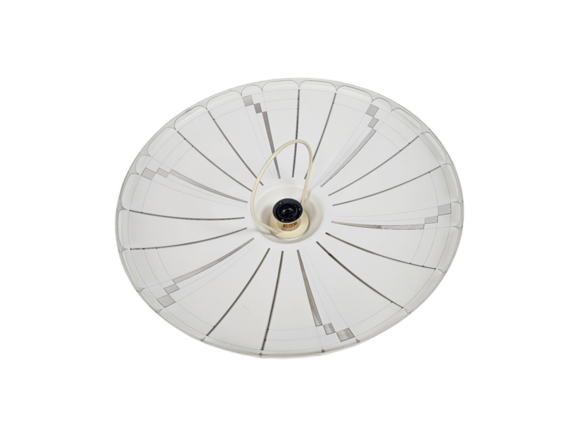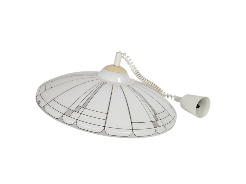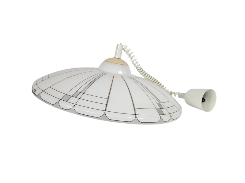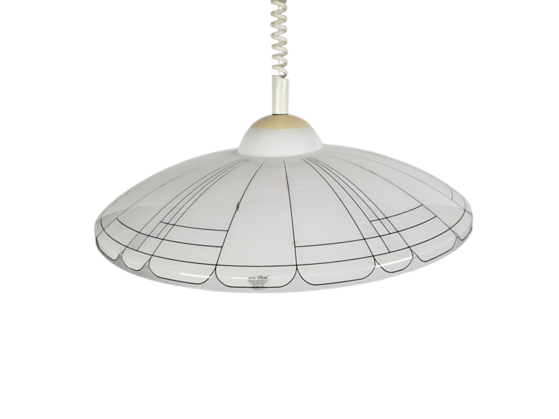 Stap terug in het futuristische optimisme van de jaren 70 met deze originele Meblo-hanglamp uit Joegoslavië. Met zijn brede koepel, gedecoreerd in een geometrisch zwart lijnenraster en opgehangen aan een iconisch spiraalsnoer, is deze lamp een opvallend voorbeeld van de designbeweging uit het ruimtetijdperk die halverwege de eeuw door Europa trok.