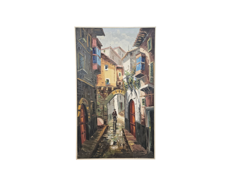 Het schilderij in de afbeelding is een impressionistisch olieverfwerk van een Europese straatscène, gekenmerkt door een smal steegje met een boog en een eenzame figuur.