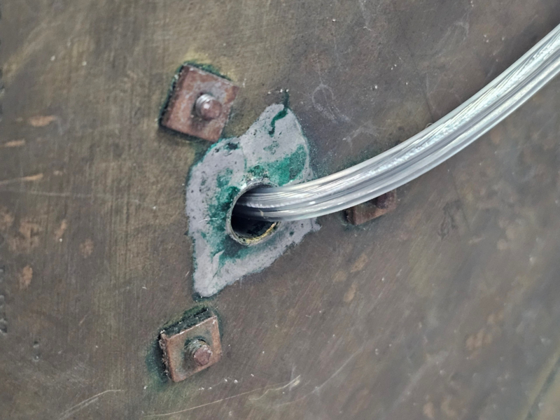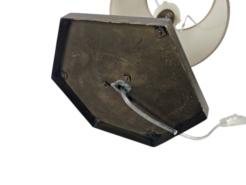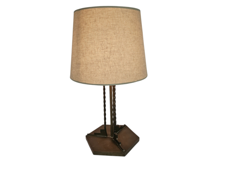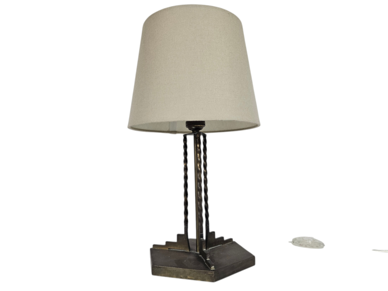 Brutalistische tafellamp, een stijl die populair was in de jaren 30/50. Deze lamp heeft een karakteristieke basis van gesmeed brons/koper met een geometrische, zeshoekige voet en getwiste verticale stangen. De elektra is vernieuwd, getest en in orde.