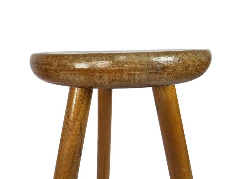 Houten driepootkruk, ook wel bekend als een melkkrukje. Dit type meubilair is een klassiek voorbeeld van landelijk of brutalistisch ontwerp, vaak handgemaakt en daterend uit het begin van de 20e eeuw.