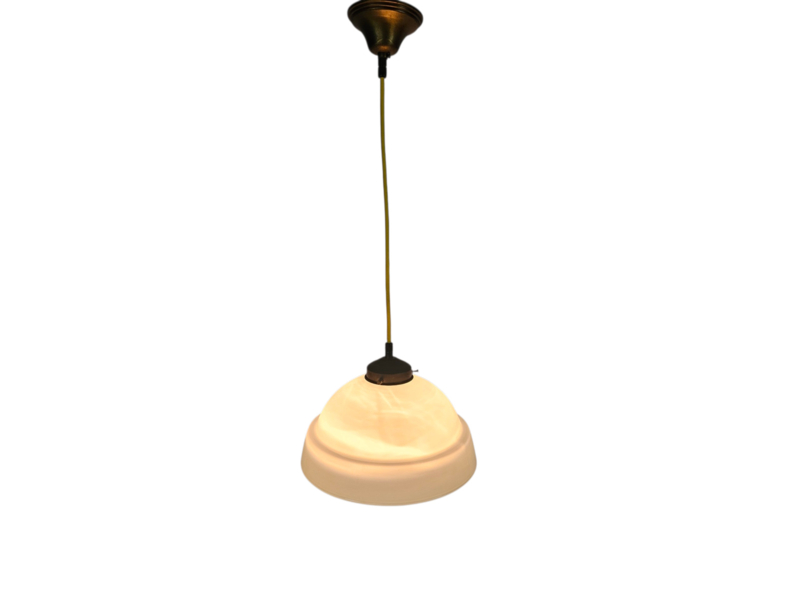 Art Deco hanglamp met een getrapte opaline glazen kap en een goudkleurig armatuur, waarschijnlijk uit de jaren 30.
