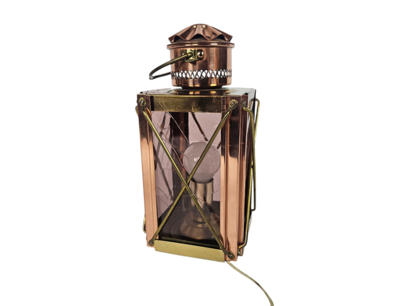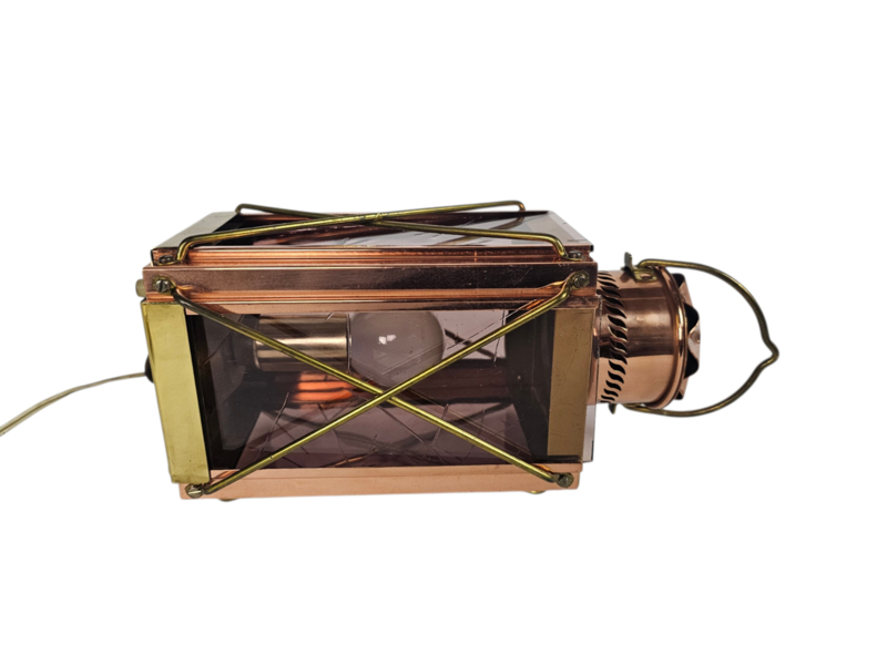 Vintage scheepslantaarn, ook wel bekend als een ruimlantaarn. Betreft een elektrisch model, voorzien van een zichtbare gloeilamp en het snoer aan de onderzijde. Vervaardigd uit koper en messing met glazen panelen. Oorspronkelijk werden dit soort lampen gebruikt als kajuit- of ruimverlichting op schepen.