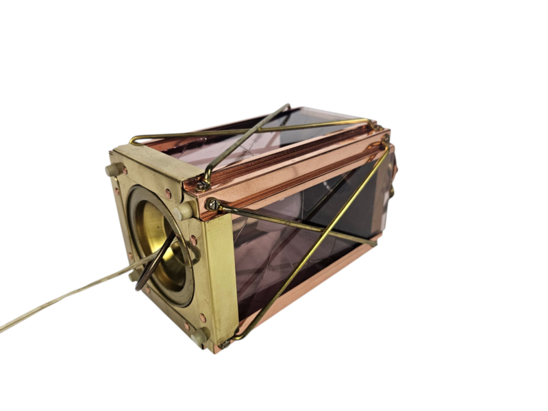 - Uitgevoerd in hoogwaardig koper en messing, met glazen panelen die een warme gloed verspreiden.