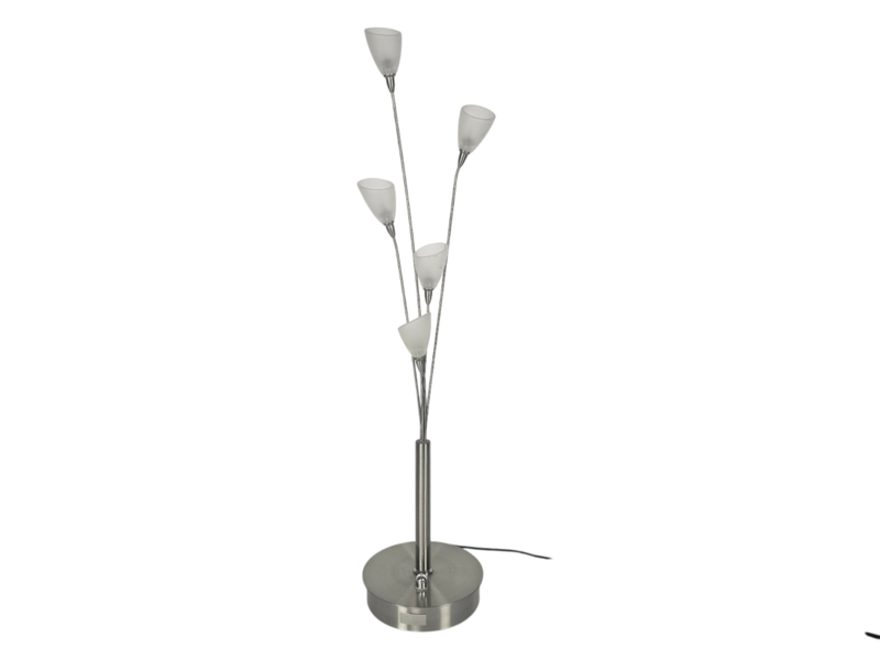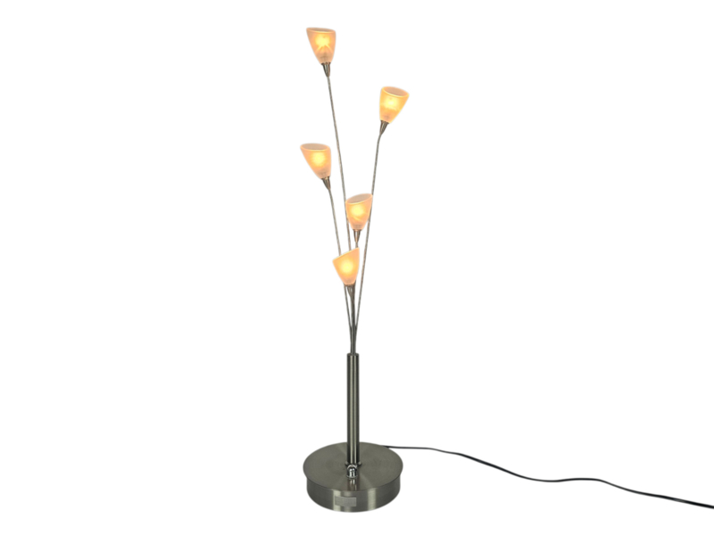 Door Jan des Bouvrie ontworpen halogeen tafellamp met ingebouwde dimmer. Vervaardigd bij Boxford Holland, geborsteld roestvrij staal, zilver kleur, met glazen kelken. Onderaan zit de originele sticker.