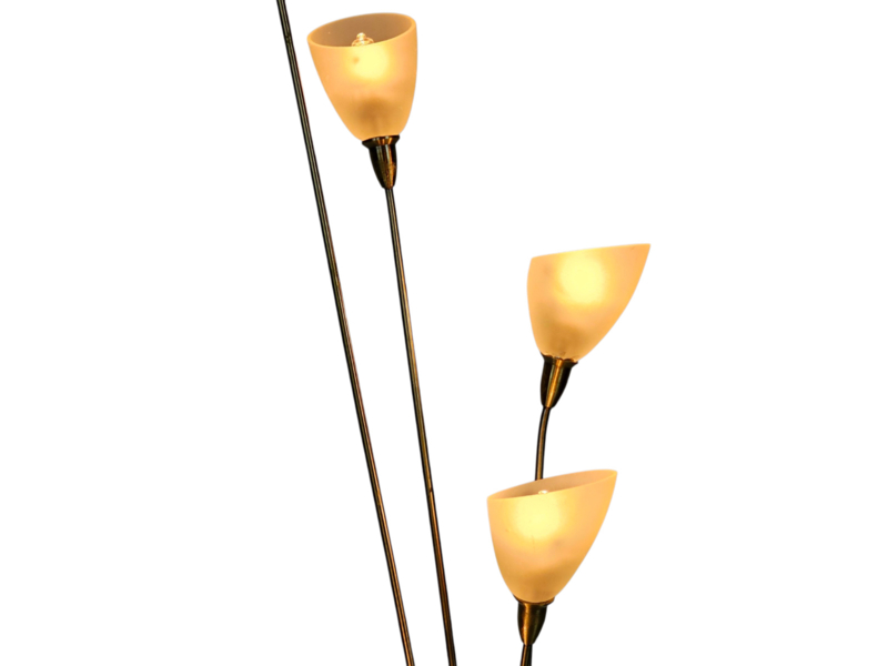 Door Jan des Bouvrie ontworpen halogeen tafellamp met ingebouwde dimmer. Vervaardigd bij Boxford Holland, geborsteld roestvrij staal, 'Champagne Gold' kleur, met glazen kelken. Onderaan zit de originele sticker.