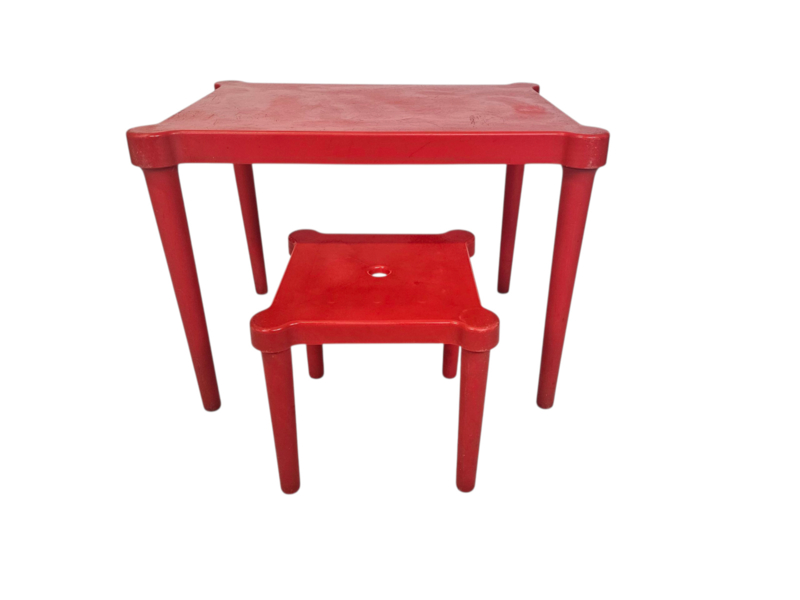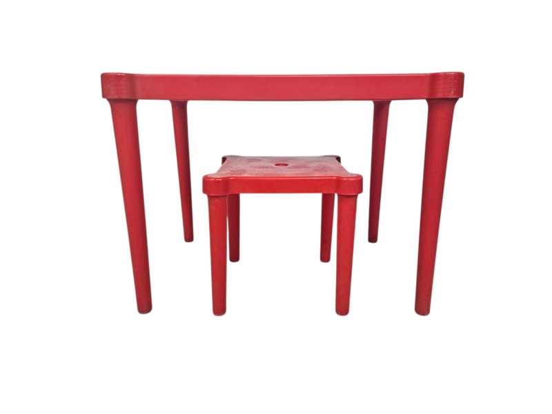 Conditie: Goed, bovenzijde van de tafel heeft wat gebruikssporen en tekenen van ouderdom - de pootjes van de tafel en het stoeltje kunnen losgeschroefd worden. Ook te gebruiken als bijzettafeltjes.